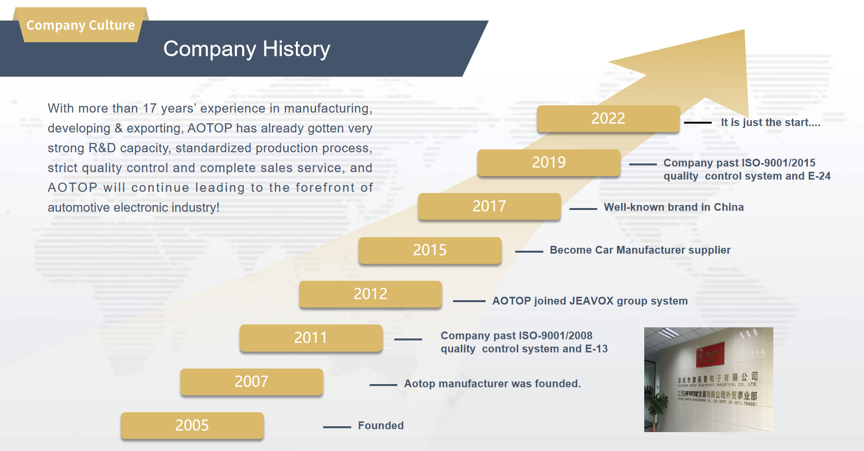 With more than 19 years' experience in manufacturing, developing & exporting, AOTOP has already gotten very strong R&D capacity, standardized production process, strict quality control and complete sales service, and AOTOP will continue leading to the forefront of automotive electronic industry!