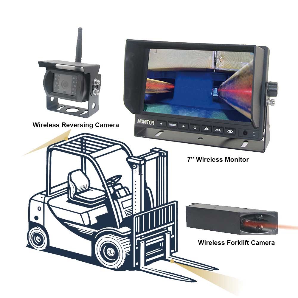 A set of forklift related wireless monitoring equipment. Includes Wireless Reversing Camera, 7” Wireless Monitor and Wireless Forklift Camera. These devices may be used to improve the safety and visibility of forklift operations, helping operators to better see around the forklift and into the forks.
