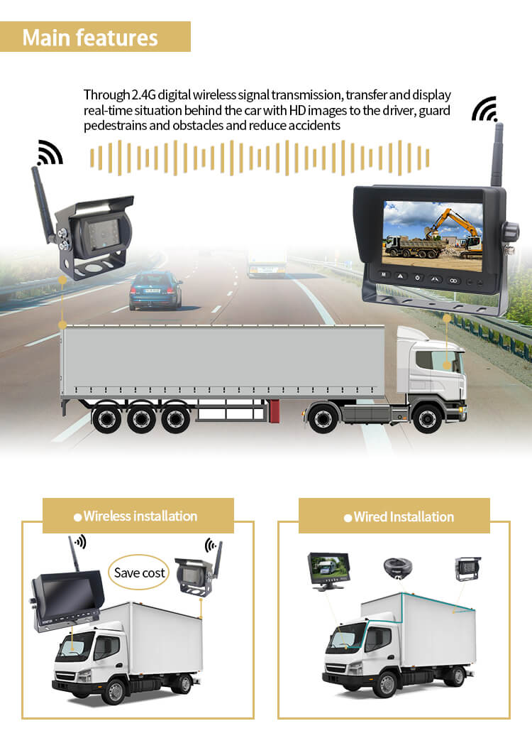 Aotop wireless digital vehicle reverse camera monitoring system includes 5 inch AHD monitor and IP69K night vision camera. With it, you can easily view what's behind your vehicle without having to lay long cables, especially for heavy & commercial vehicles such as trucks, harvesters and trailers. If you are looking for high quality wireless car camera system, please contact sales@aotop.com.