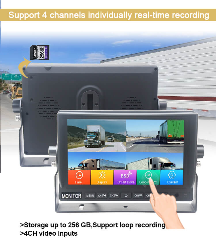 CM-709HQ-BSD vehicle rear view monitor supports 4CH HD camera video signal input, connecting 4 cameras to achieve all-round monitoring around the vehicle, effectively reducing the risk of collision or scraping caused by blind spots. Built-in 3CH AI algorithms to detect and identify pedestrians & vehicles, and collision avoidance alerts to remind drivers of potential risks. For more AI BSD monitor details, please contact us sales@aotop.com.