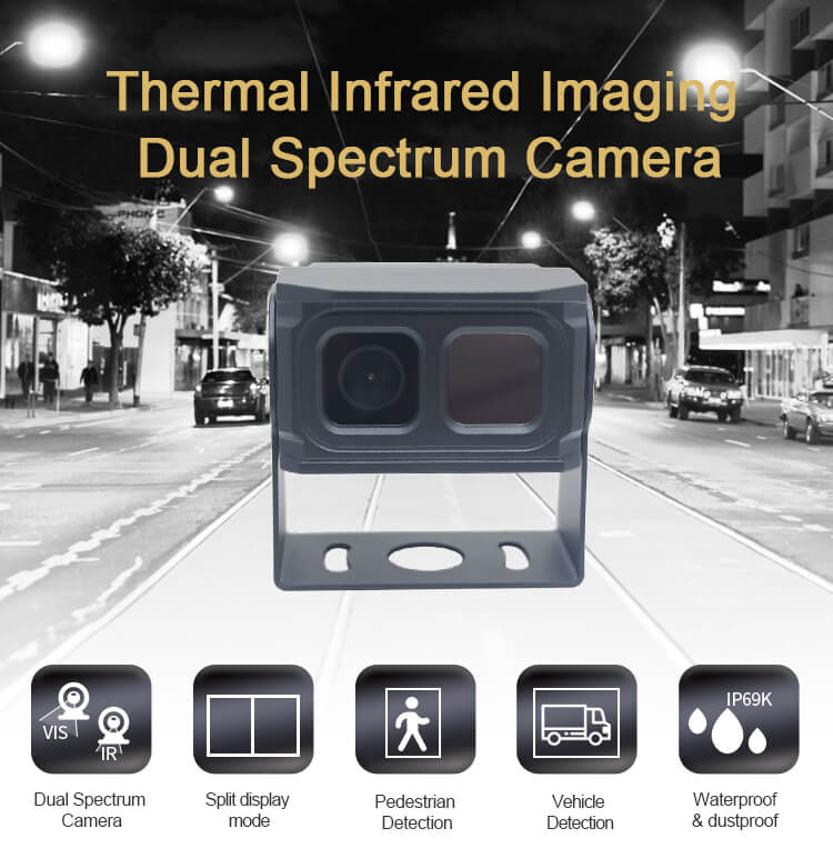 Aotop thermal infrared imaging dual spectrum camera dual lens design, with an infrared and visible light thermal camera in one, allowing for dual light overlay, split screen display and many other modes. The high thermal penetration of infrared provides an excellent field of view in a variety of low visibility conditions, help driver seeing farther and clearer. For more information please contact us at sales@aotop.com!