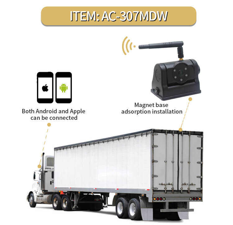Aotop offer the best wireless magnetic WIFI backup camera, which can conveniently view the situation behind the vehicle on the mobile phone, with a wireless transmission distance of 25M. Built-in 6400Mah battery, can work continuously for 32 hours. Features High-quality image, night vision, IP67 waterproof, etc. Magnetic installation is fast to install, and is an ideal choice for improving the reversing safety of commercial vehicles! If you need to know more, please contact sales@aotop.com!